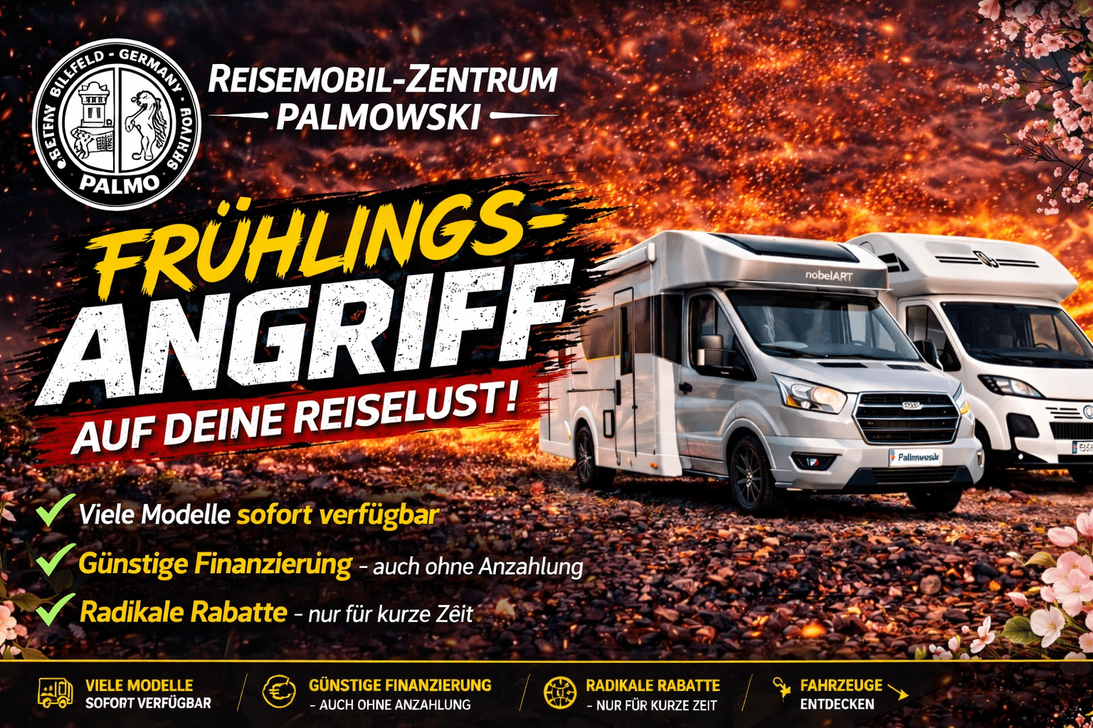 PALMO Discount, Deutschland’s größter Fachhändler für Reisemobile, steht Ihnen mit seiner Erfahrung von 50 Jahren zur Seite. Auf unserer Discount-Seite präsentieren wir Ihnen die unglaublich günstigen Angebote der beliebtesten Reisemobil-Marken.